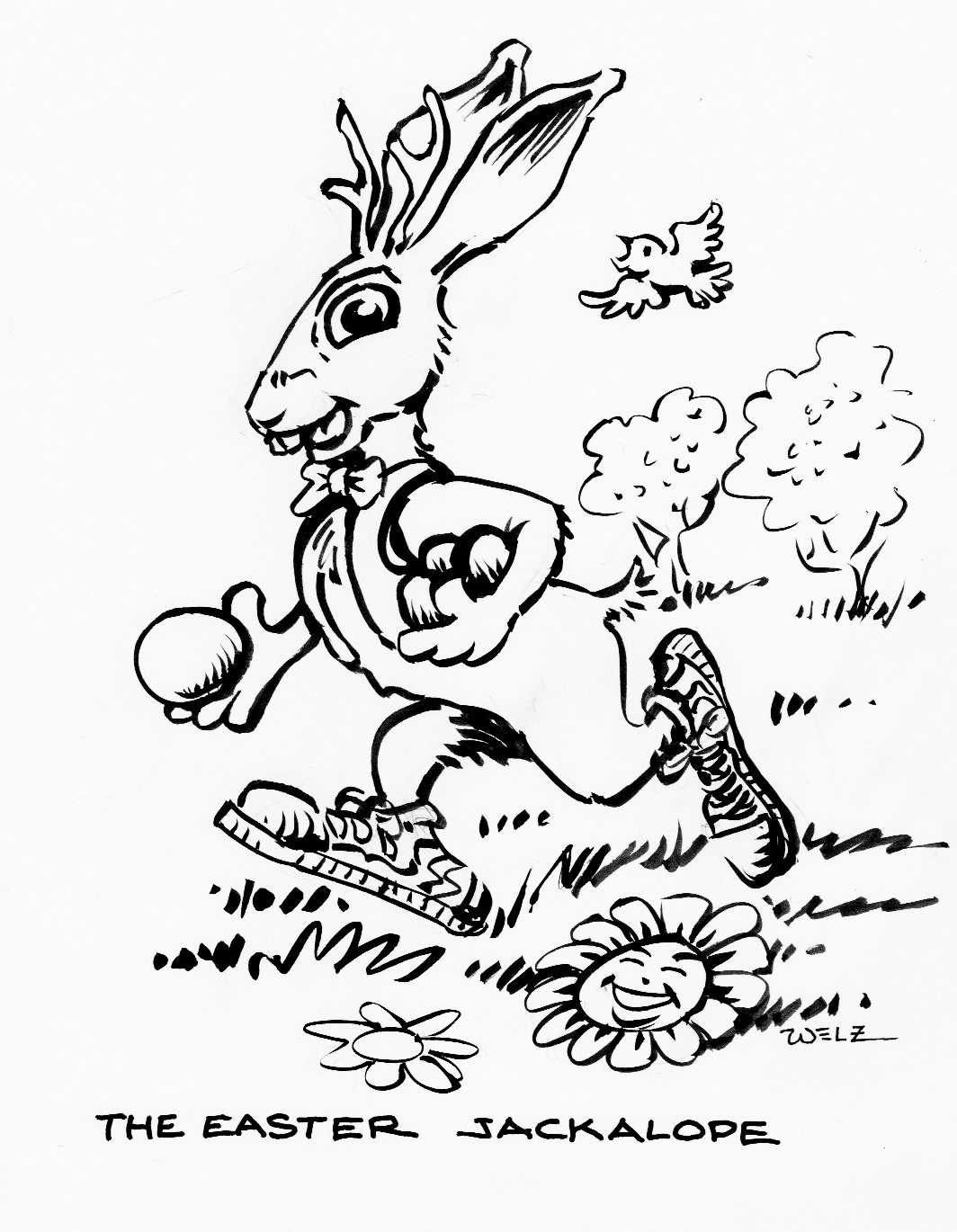 Yeah, well, I didn’t put anything up yesterday, on Easter, I do my drawing & stuff in a little space 6 miles from the house we’re living in & I usually take Sundays off & stay home, especially that Sunday, being Easter, not that we were celebrating a religious holiday, ’cause it’s not, of course, Easter was celebrated for thousands of years before there was a Christian church & somehow rabbits became associated with Ostara the Goddess of Spring the Bringer of Light, but it’s actually a hare which is different from a rabbit, cottontail bunnies are rabbits, jackrabbits are hares, which are often depicted in some old stories as tricksters, mischief makers, Bugs Bunny is a hare (he should have taken a left turn at Albuquerque). So the story goes that a little bird was left & forgotten by Ostara, almost died in the snow but Ostara finally returned & revived the little bird, who was so happy & grateful that it sang her praises all around, so Ostara for some reason turned it into a hare that could lay eggs, being still part bird, so it did that, laid eggs all around in the fresh grass that had just grown out of the now warm, well-lit ground. Then it split, leaving the children to discover the evidence of her passing through, so it must have been a she, it laid eggs, right? Guess they didn’t get fertilized; none of them ever hatch, do they? So is the Easter (not)Bunny immortal like Santa Claus, or do some of the eggs, the ones that don’t get found, hatch & bring forth a new generation like the New Year? Anyway, if jackrabbits are hares, then out here in the Wild West it must be the Easter Jackalope.